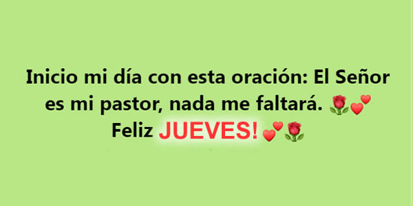 Feliz jueves con frases bonitas. Inicio mi día con esta oración, el señor es mi pastor nada me faltara, feliz jueves. Encuentra las mejores frases bonitas para recibir un nuevo día, miles de imágenes con frases de buenos días. Jueves cuarto día de la semana civil, quinto de la litúrgica.
